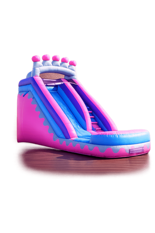 Make your party feel like a royal celebration with the Pink Palace Waterslide! Standing at 14 feet tall, this beautiful slide features soft pinks, purples, and royal crown accents that bring princess dreams to life. Perfect for little royalty who love big splashes, this slide offers a thrilling ride down into a refreshing splash pad — ideal for cooling off on a hot day!